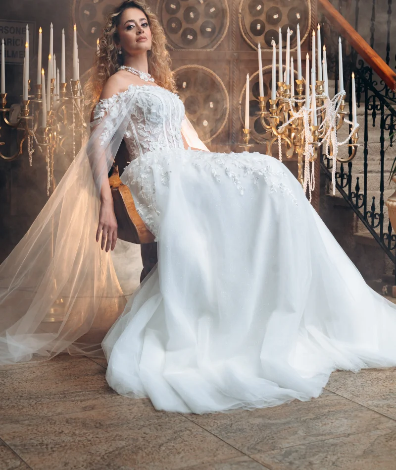 Gülsial A Kesim Dantel Gelinlik Gülsial gelinlik koleksiyonunda yer alan A kesim dantel gelinlik modeli, zarafeti ve şıklığı bir arada sunuyor. Dantel işlemeleri ve etek kısmındaki tül detayları, gelinliği çok daha romantik ve zarif hale getiriyor. Ayrıca, bu gelinlik modeli bel kısmından başlayarak açılan A kesim modeli sayesinde gelinlere rahat bir hareket kabiliyeti sağlıyor.